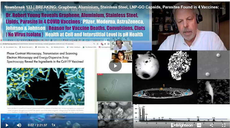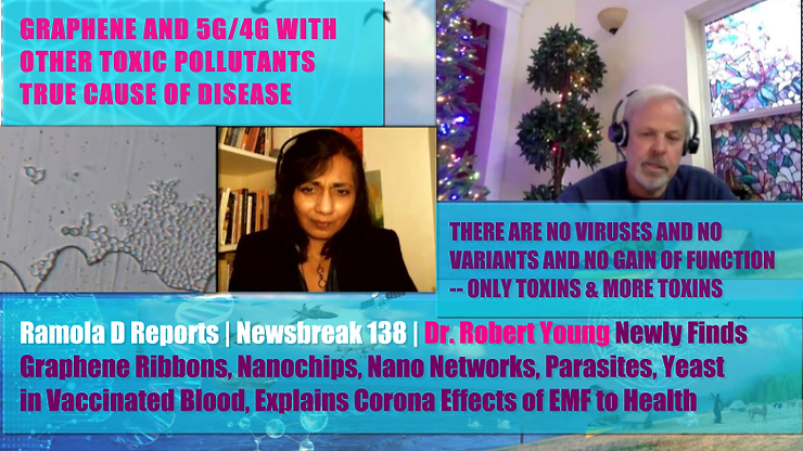 Wide-ranging conversation with research scientist, biochemist, and clinical nutritionist Dr. Robert Young displaying his new video and micrograph finds of graphene nanoribbons, nanochips, and forming nano networks in vaccinated blood, and speaking about the true cause of all disease as internal-environmental toxins and pollutants developing from external-environmental toxins and pollutants, bacteria and yeast forming as outfection and pleomorphic expression of cellular breakdown, as also on the harmful effects of all EMF, microwaves and millimeter waves on human health, and the great importance of maintaining alkaline balance and high alkaline pH in the body to stay healthy in the face of the massive assaults with toxins, pollutants, and electromagnetic radiation on humanity–from chemtrails, aerosols, vaccines, 4G, 5G, etc.