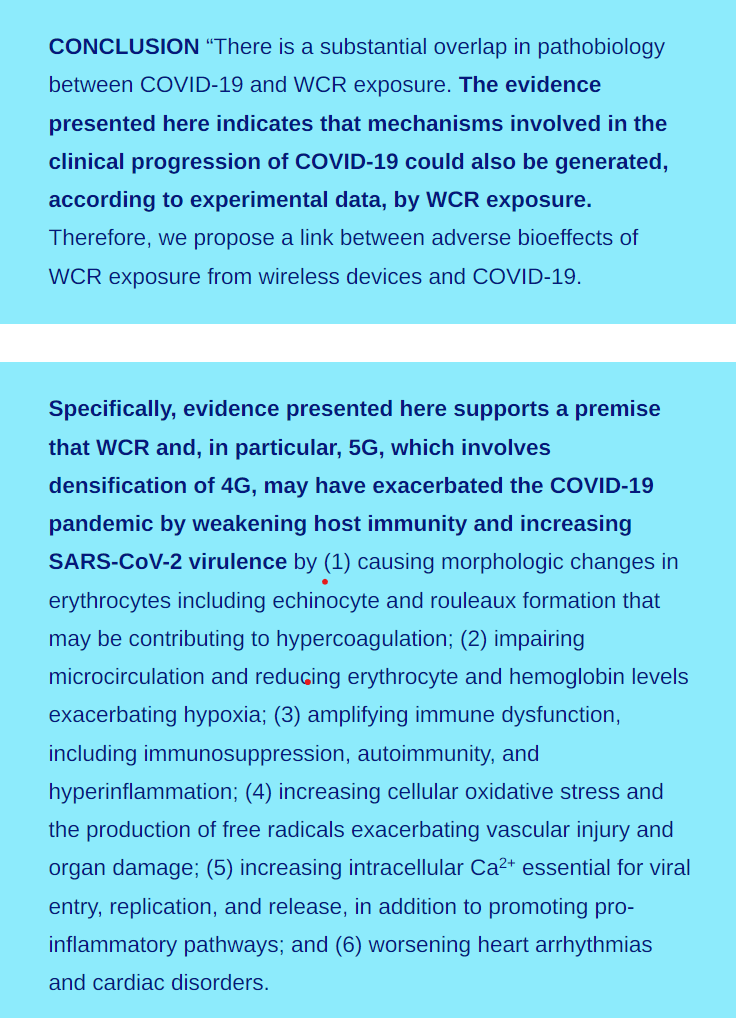 The authors conclude an undeniable link between the phenomenon of “COVID-19” and WCR, particularly 5G exposure–which includes 4G exposure through densification of 4G discussed in the paper–and state that the evidentiary research data shows that exacerbated symptoms of COVID such as hypoxia and inability to breathe can also be generated by radiation exposure: