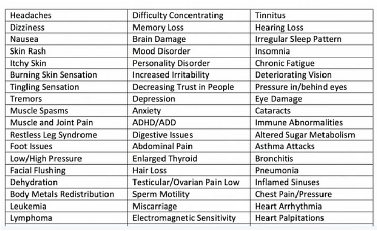 Image: Effects of 5G–Titled Symptoms of 5G Radiation Poisoning by Dr. Robert Young, https://staging.drrobertyoung.com/post/the-connection-between-5g-and-the-corona-virus | Titled Symptoms of Microwave Illness at http://www.microwavedvets.com