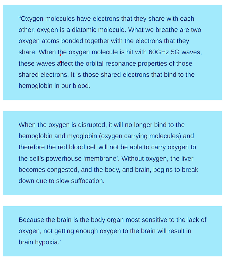 Several scientific papers corroborating this information can be found online: when 60 GHz is pulsed through atmospheric oxygen molecules, their binding electrons’ orbital resonance is energetically affected, disrupting the molecule such that breathing it in will not help, the oxygen-hemoglobin bond cannot be made, red blood cells are starved of oxygen and begin to clot, leading to hypoxia–oxygen starvation in lungs and brain, oxidative stress, organ damage and death. At lower levels from any kind of microwave radiation damage, hypoxia would cause a range of other issues including heart disease, infertility, cancer, DNA mutations, and sleep deprivation.