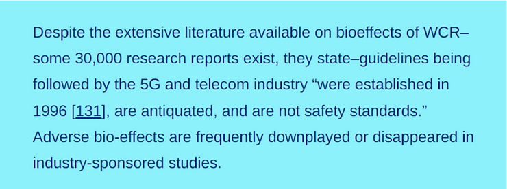 The harmful effects of Wireless Communication Radiation (WCR) as well as the greater harms of highly pulsed frequency radiation as in 5G with ELF carrier frequency modulation have been extensively studied, they report, by scientists both in the military and public-domain spheres.