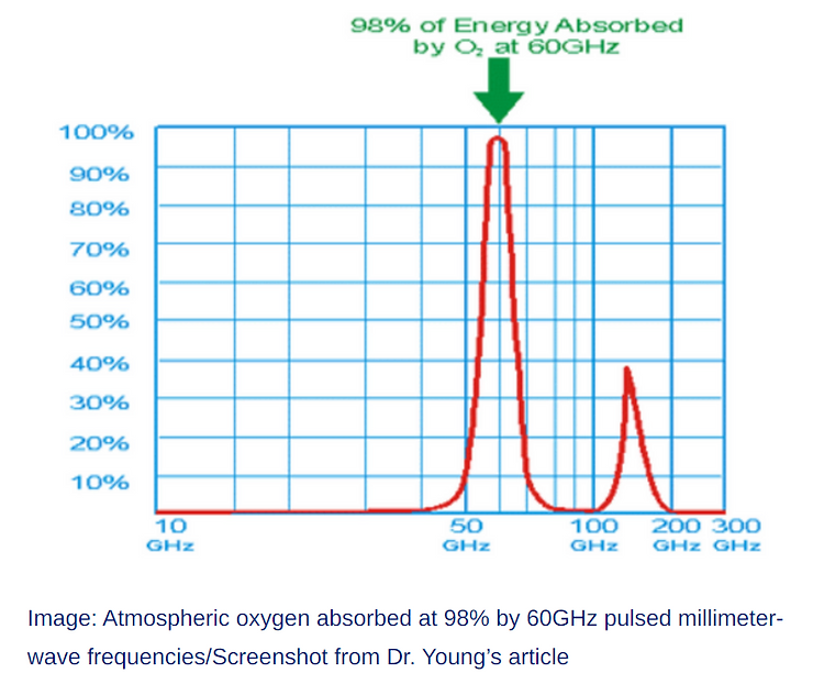 In this very pointed and educative article, Dr. Young further elaborates on the symptoms of 5G radiation poisoning and compares the worst of them to what is observed in COVID, inability to breathe, coughing, and sudden hypoxia including brain hypoxia which leads to seizures and falling over, as reported in early days in Wuhan, explaining how the very high frequency oscillations of 5G millimeter waves from 3 to 100 GigaHertz absorb atmospheric oxygen and at the specific oxygen-absorption frequency of 60Ghz, transform the oxygen molecule into a form unusable by the body.