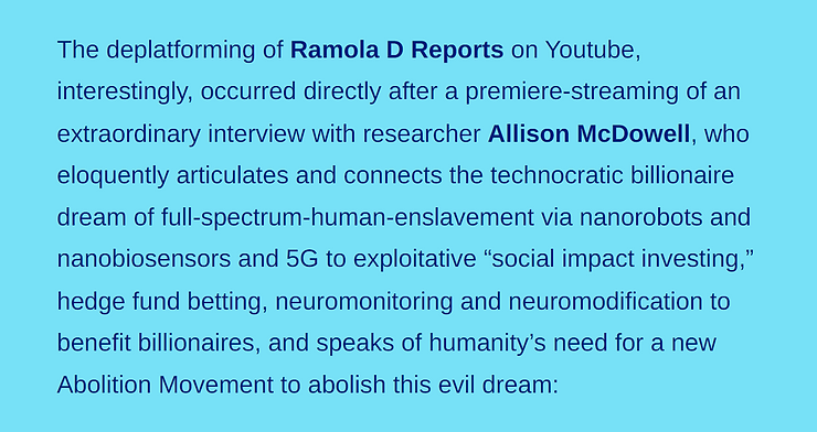 Something else to recall is that all video reports and podcasts tracing this 5G/Covid connection were immediately (and suspiciously) yanked off Youtube, Facebook and other mainstream social media platforms in mid-2020 with truth media channels yanked off Youtube as also this writer’s on 3 March 2021, as researcher Frances Leader noted recently in Report 271 at Ramola D Reports, where she also examined the 5G connection and the long hidden history of EMF bioeffects and disease-creation, long and wrongly attributed to non-existent viruses, which she too has written about in several articles–a bombshell reveal to many: