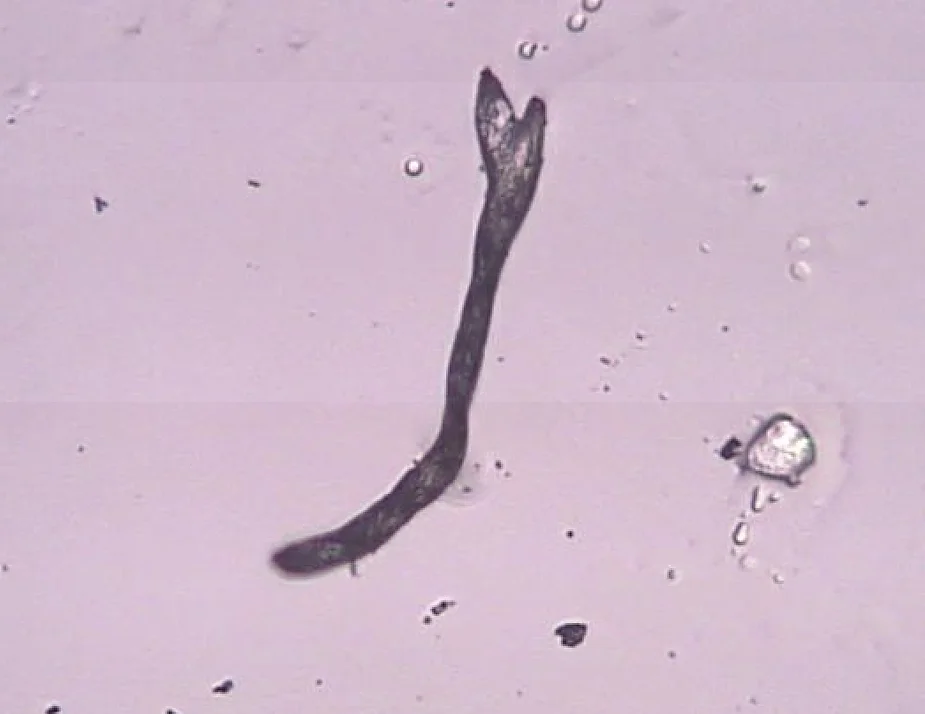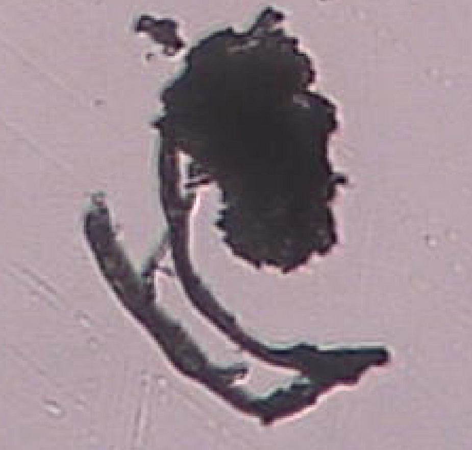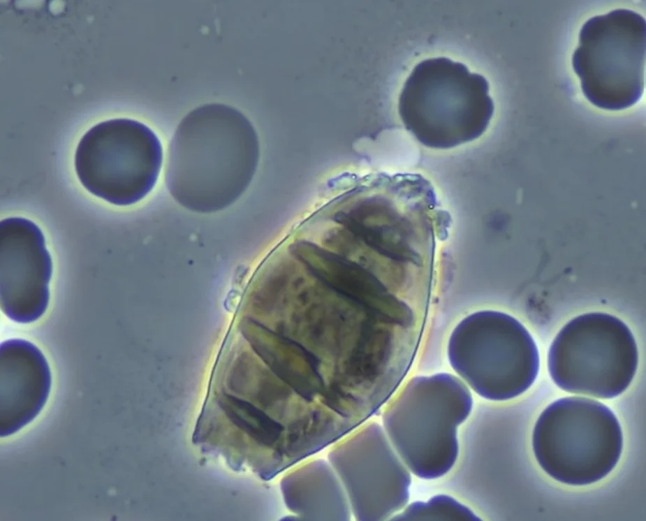 7. Graphene oxide in the center of what appears as a vulgaris bulgarus parasite at 1500x magnification observed in the live capillary blood under phase contrast microscopy in a VAXXinated female.
