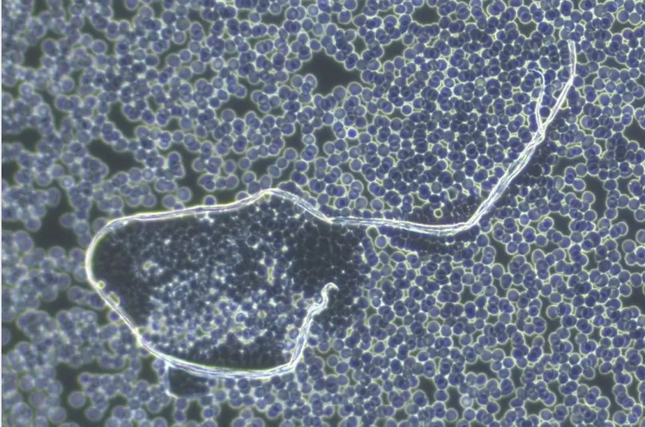 14. A large fibrous graphene oxide micro blood clot observed in the live unchanged and unstained capillary blood of a VAXXinated female under pHase contrast microscopy.