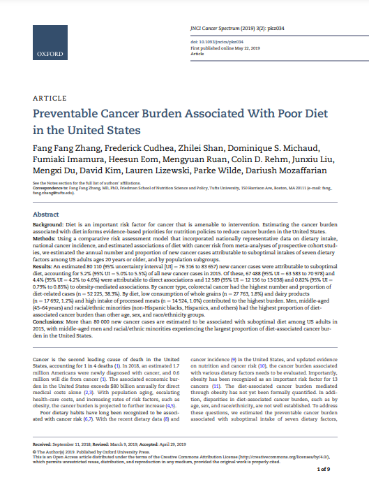[1] Zhang, F. F., Cudhea, F., Shan Z., Michaud, D., Imamura, F., Eom, H., Ruan, M., Rehm, C. D., Liu, J., Du, M., Kim, D., Lizewski, L., Wilde, P., & Mozaffarian, D. Preventable cancer burden associated with dietary intake in the United States. JNCI Cancer Spectrum, 2019 DOI: 10.1093/jnci/djz079