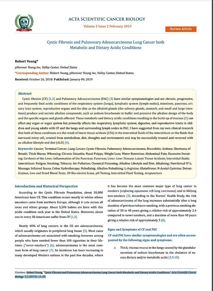 [6] Young, R. O., “Cystic Fibrosis and Pulmonary Adenocarcinoma Lung Cancer both Metabolic and Dietary Acidic Conditions”. Acta Scientific Cancer Biology 3.2 (2019): 11-20. – https://www.actascientific.com/ASCB/pdf/ASCB-03-0092.pdf