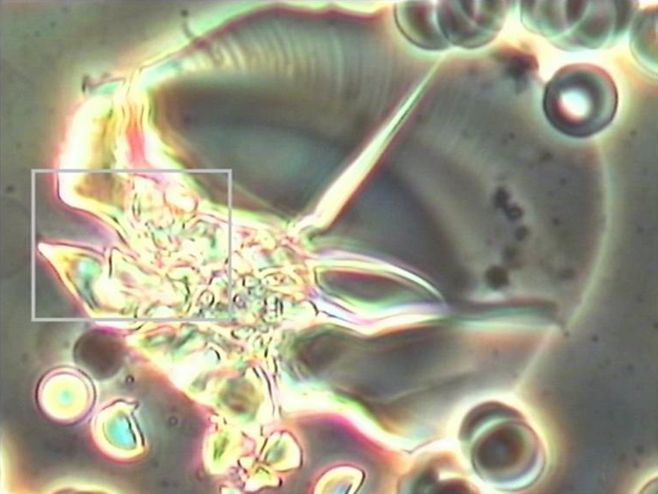 In my research utilizing bright-field, dark-field and phase-contrast microscopy, it is common to see crystallizations of acidic waste in the blood as seen below.