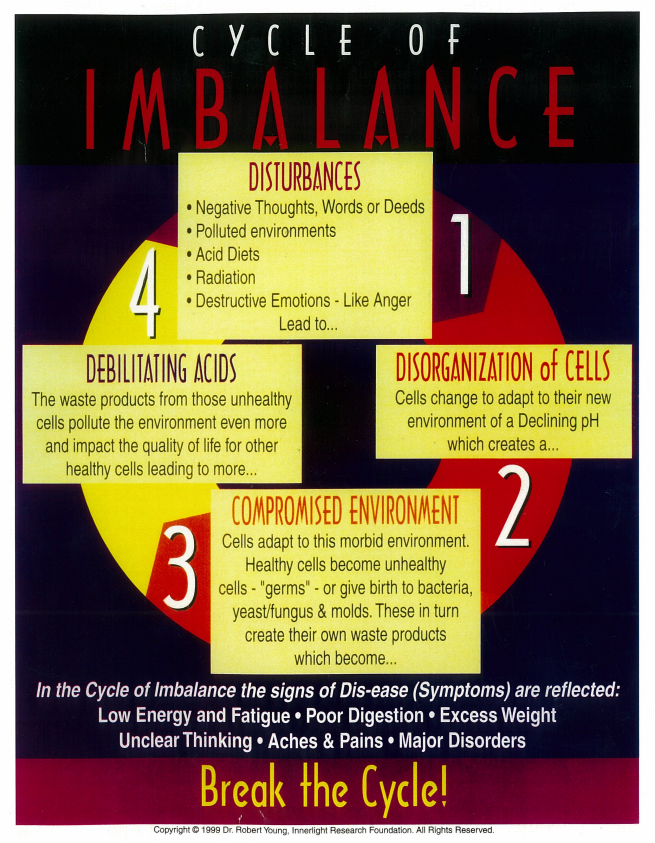 The aforementioned causal (alarming) situation, or modification of the medium, is chronic acidification (pH imbalance) and oxygen deprivation in the blood and tissues due to acid-forming foods, adverse lifestyle, emotional stress, and environmental stress. This is not an oversimplification.