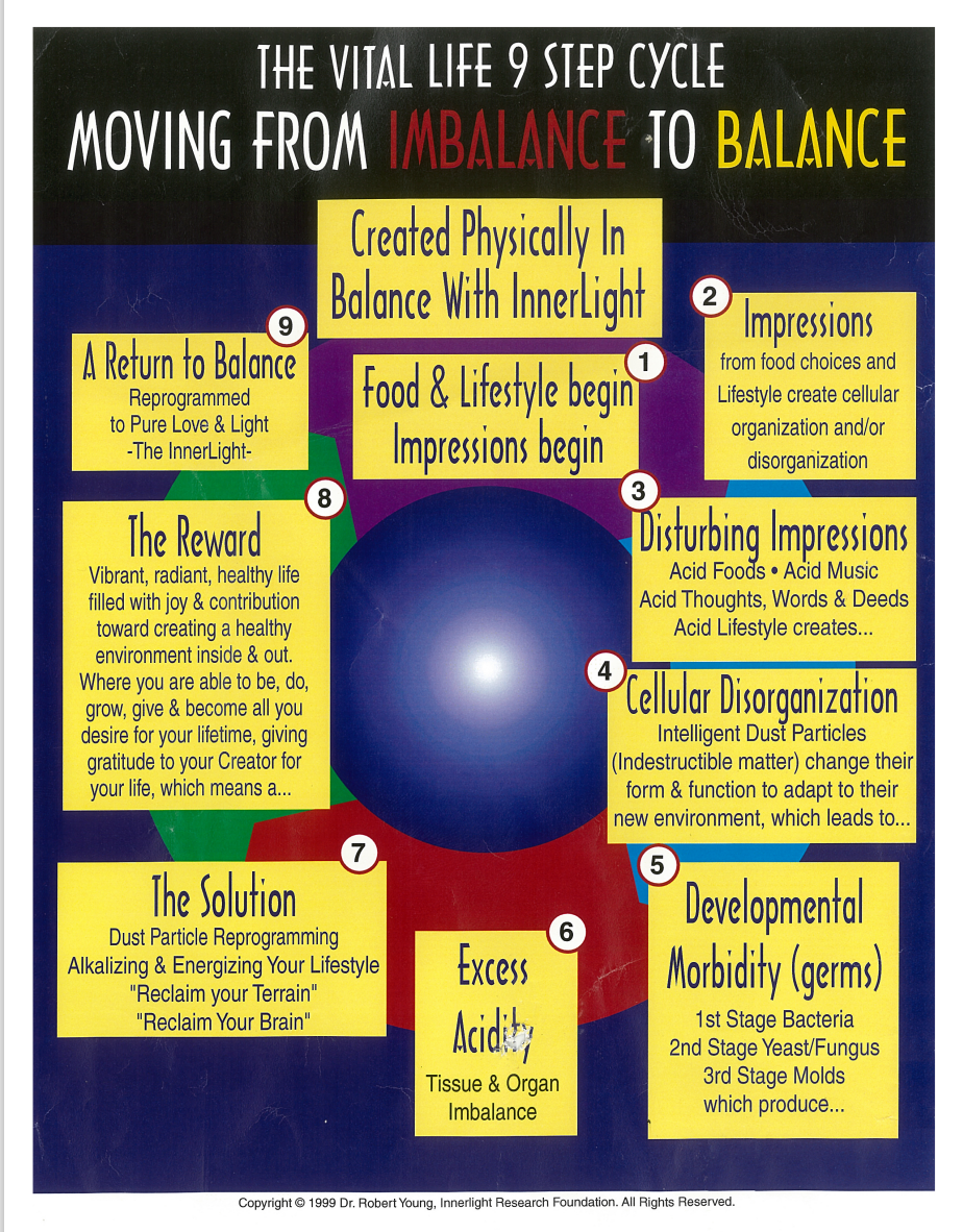 There is only one physiological disease-terrain imbalance seen as acidification, due primarily to an inverted or perverted way of eating and living. Acidification leads to the one sickness, or the primary symptom of disease-morbid microzymian response, or the overgrowth of microforms whose poisons result in secondary symptoms (commonly called “diseases”), these being produced in or by the body in keeping with the uniqueness of each individual.