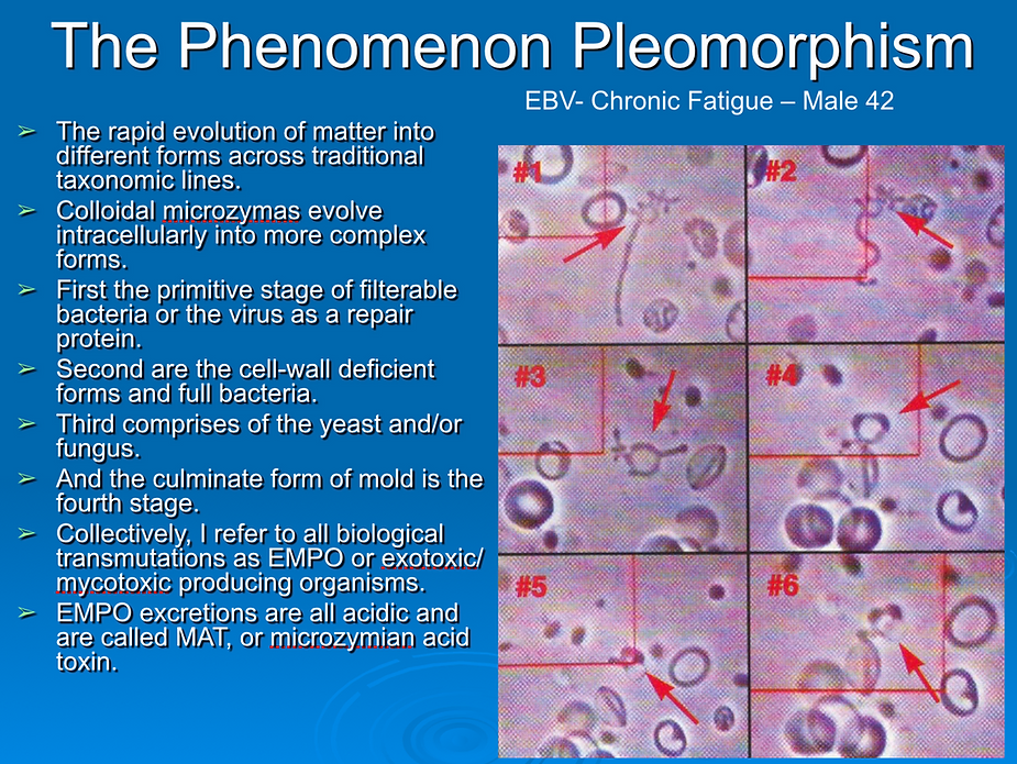 Biological Basis for the Pleomorphic CyclThere is a common biological basis for the pleomorphic cycle and its increasing complexity of organization: More complex forms evolve inherently upon the death of an organism for the purpose of recycling its anatomical and chemical structures in the carbon cycle. The process of rapid evolution (which is reversible) is an essential life process which, beyond the repair stage, is necessary to return a dead organism to the earth. The second and third-stage microforms degenerate the body’s vital substances and tissues via putrefaction (bacteria) and fermentation (yeast and fungus). Fermentation results in acid waste products, which further break down tissue.