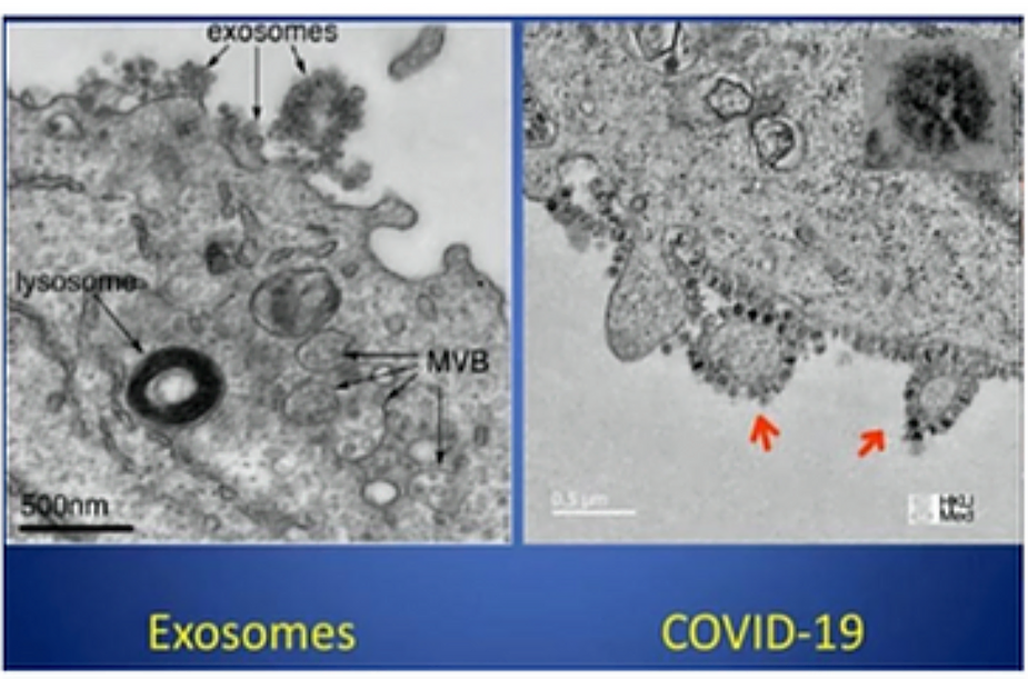 For example, the coronavirus is not a virus that infects the cell but an exosome which is endogenously created and released by the cell as a repair protein. The following electron micrography shows the release of these nano particles called exosomes which are born in and released from the cells as a response to a toxic acidic interstitial fluid environment and not the invasion of some infectious nano organism like the so-called coronavirus, monkeypox or HIV.