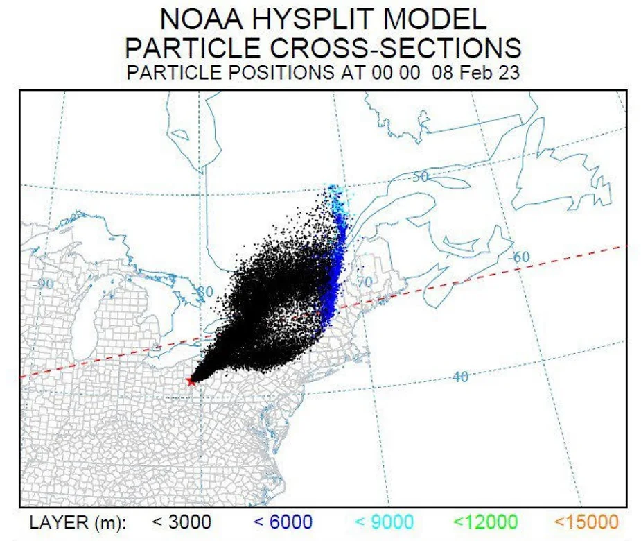 The National Oceanic and Atmospheric Administrations (NOAA) on February 8th, 2023 charted the phosgene poisoning from East Palestine, Ohio heading east to New York, north to Quebec, Canada and south to Virginia.