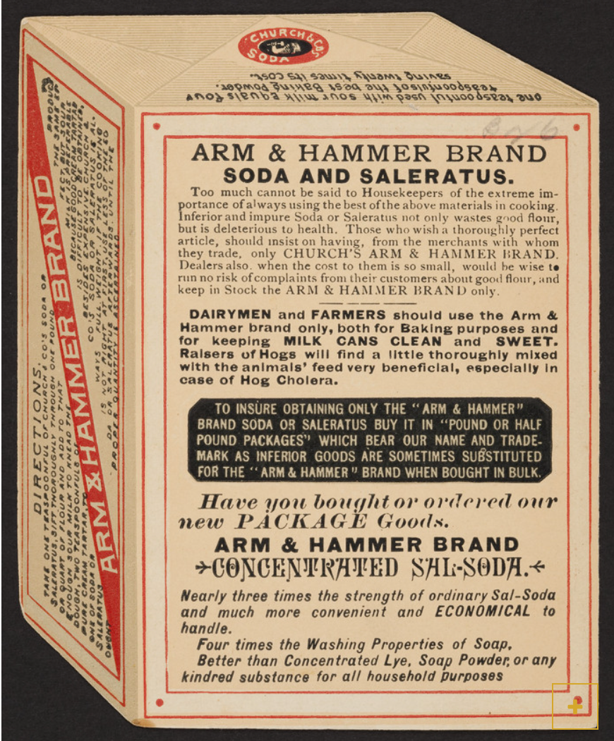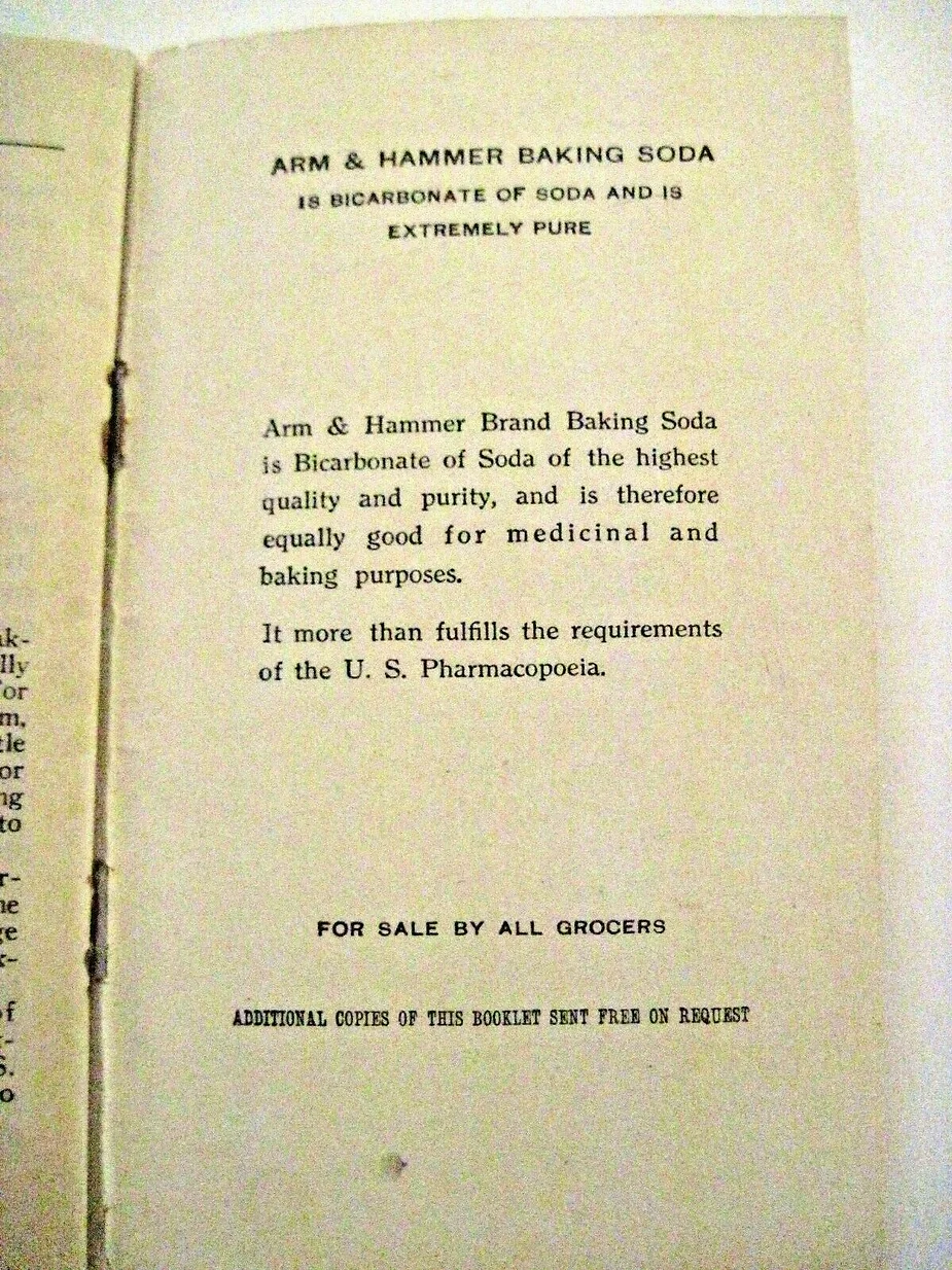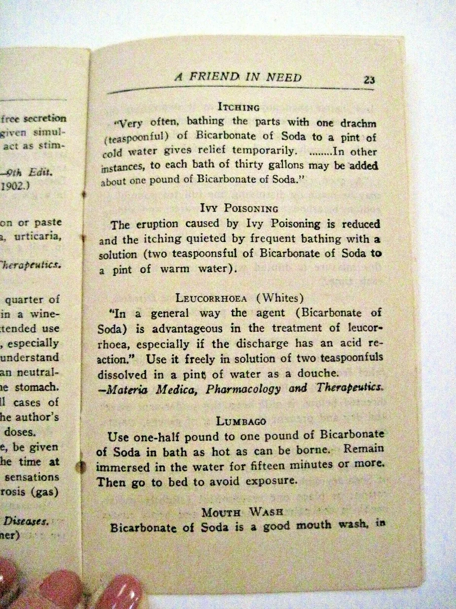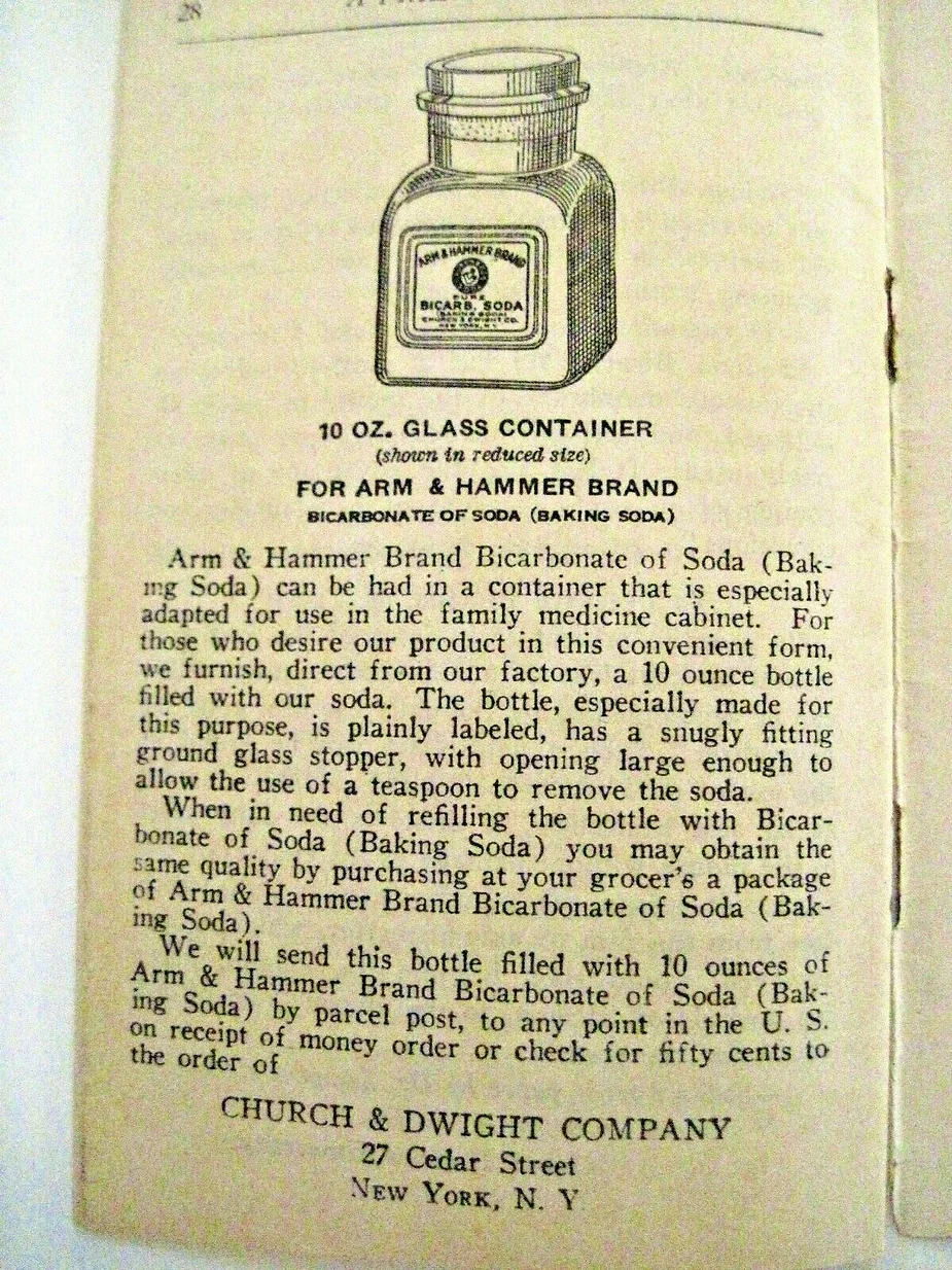 The following information appeared in the sales material and on the label of the Arm and Hammer bicarbonate salts until the FDA made the Manufacturer, Church and Dwight remove any medicinal claims in the 1940’s.