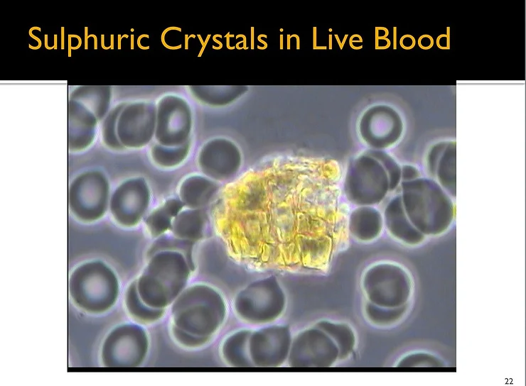 The second micrograph shows a yellow and orange crystal indicating sulphuric and uric acid crystals in the blood and found in excess amounts in patients who ingest animal flesh on a daily basis and have symptoms of digestive issues, bowel congestion, diabetes and gout.