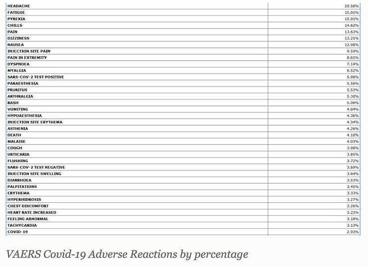 The latest VAERS HHS Clinical Adverse Reactions and Deaths due to the experimental COVID injections ranked by percentage can be viewed below.