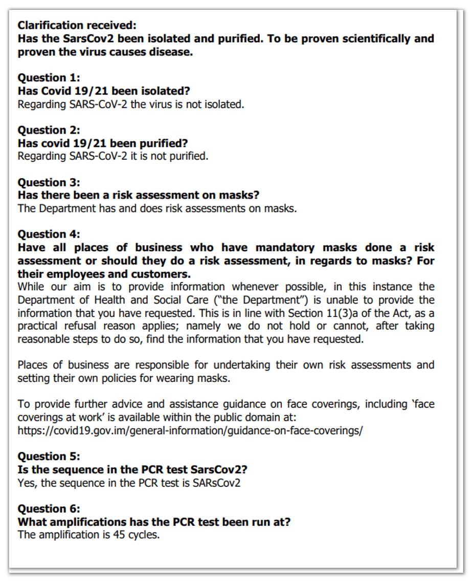 An FOIA response from Spain’s Ministry of Health, this one involving many questions around isolation/purification, characterization, culturing etc. of the alleged “COVID-19 virus”. Here are the questions posed by the organization Liberum (provided to me by a member) along with an automated English translation, and the response also with an automated English translation.