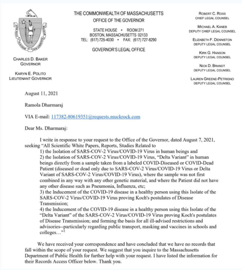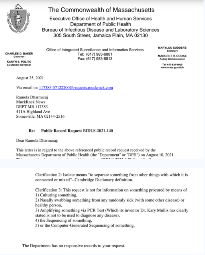The letter states “The Department has no responsive records to your request,” the Massachusetts Department of Public Health responded to a FOIA request under Massachusetts Public Records Law made on August 7, 2021 by this reporter requesting information on all scientific white papers and studies related to the isolation of the “SARS-COV-2 Virus/COVID-19 Virus” and the “Delta Variant” in human beings, essentially admitting it has no information on the much-propagandized virus on the basis of which the Commonwealth of Massachusetts has held the state hostage since last spring, issuing a number of COVID restrictions and absurd mandates and guidances which curtail the Constitutionally-protected freedoms and rights of all Americans living in Massachusetts–-and which still do so, especially targeting public-transportation users, retail-workers, healthcare-workers, college students, and schoolchildren.