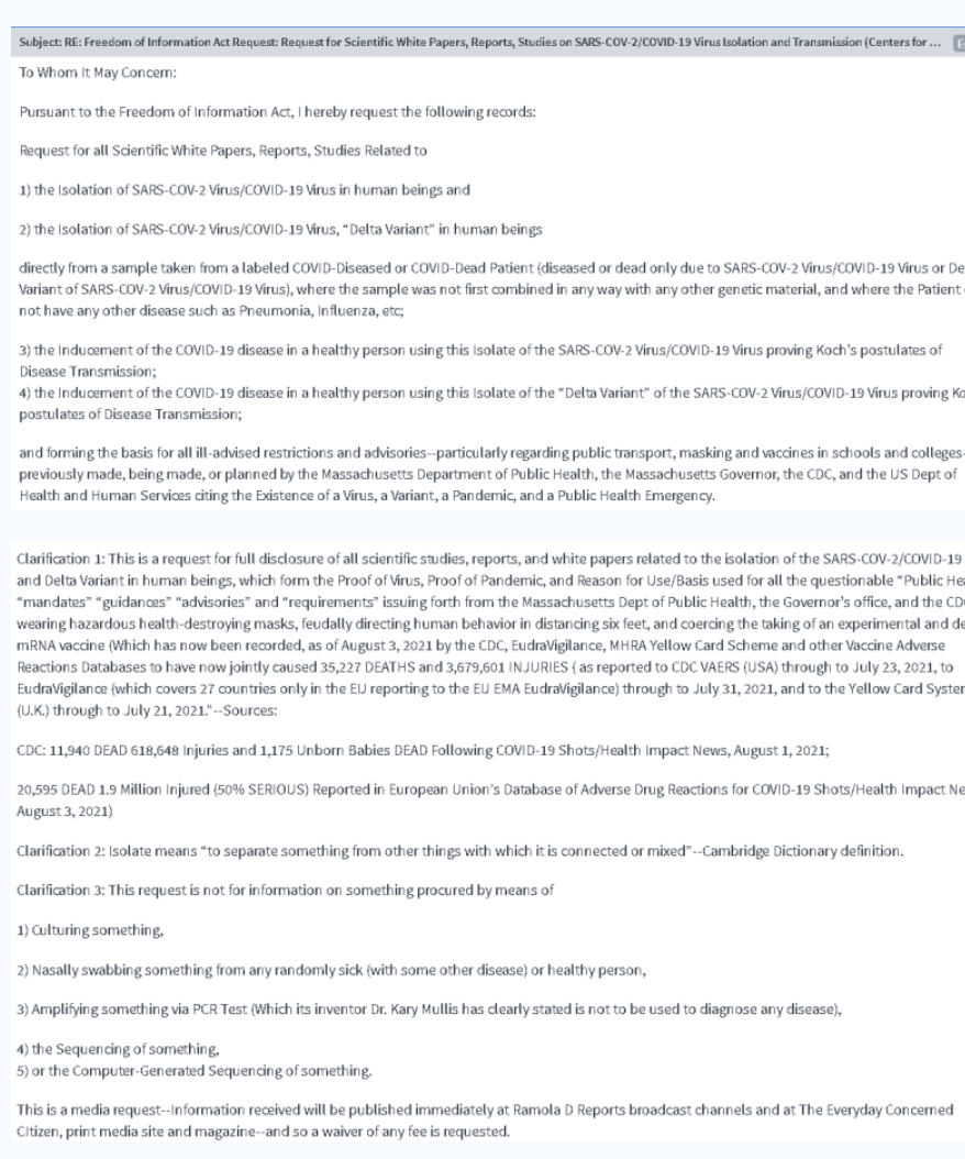 Clarification 1: This is a request for full disclosure of all scientific studies, reports, and white papers related to the isolation of the SARS-COV-2/COVID-19 virus and Variants in human beings, which form the Proof of Virus, Proof of Pandemic, and Reason for Use/Basis used for all the questionable “Public Health” “mandates” “guidences” “advisories” and “requirements” issuing forth from the Departments of Public Health, the Governor’s office, WHO, and the CDC, for wearing hazardous health-destroying masks, feudally directing human behavior in distancing six feet, and coercing the taking of an experimental and deadly chemical laced mRNA vaccine (Which has now been recorded, as of August 3, 2021 by the WHO, CDC, EudraVigilance, MHRA Yellow Card Scheme and other Vaccine Adverse Reactions Databases!