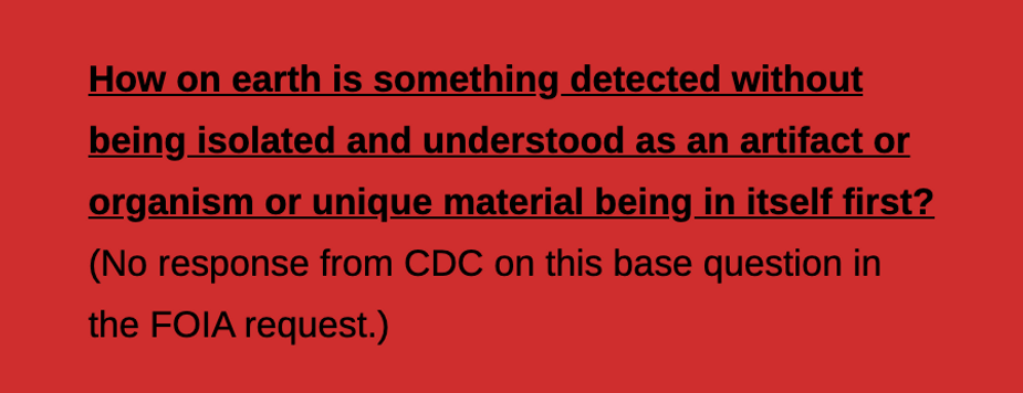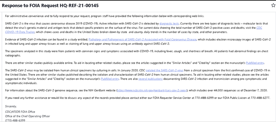 Previously also, the CDC had been queried by Christine Massey and returned a response on June 7, 2021 stating there was no information on a purified isolate of the professed SARS-COV-2/COVID-19 virus.