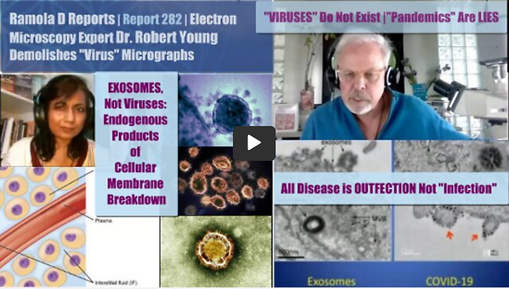 EXCLUSIVE: Dr. Robert Young, a 40-year electron microscopy expert and biochemist and nutrition scientist examines the “virus” micrographs published by governments and health “authorities” and describes what they really are: exosomes or repair proteins which are a by-product of cell membrane breakdown in the presence of chemical toxins or radiation assault, dispatched by the body’s innate intelligence system to prevent internal bleeding and activate a protective clotting mechanism in the process of removal of toxins and self-healing, wrongfully identified by many in Science, Microbiology, and Public Health as viruses.