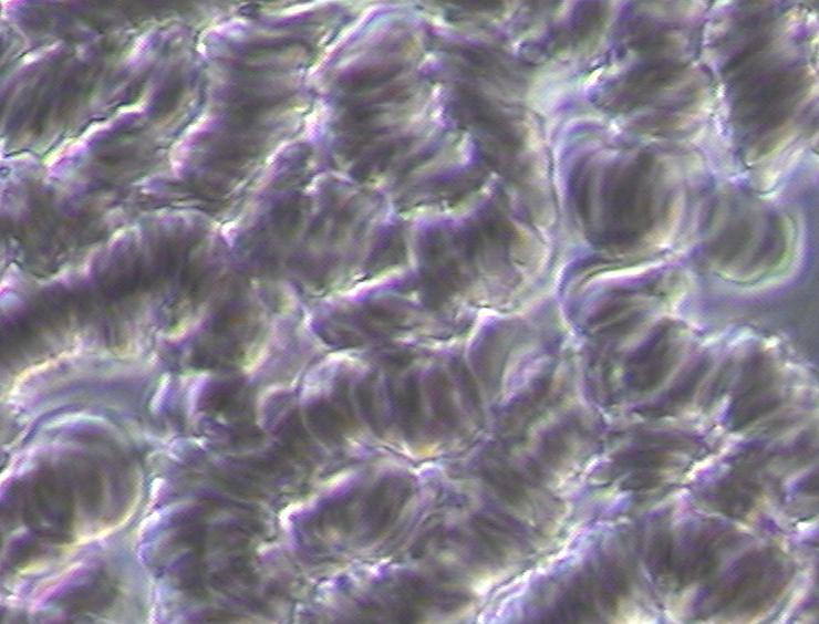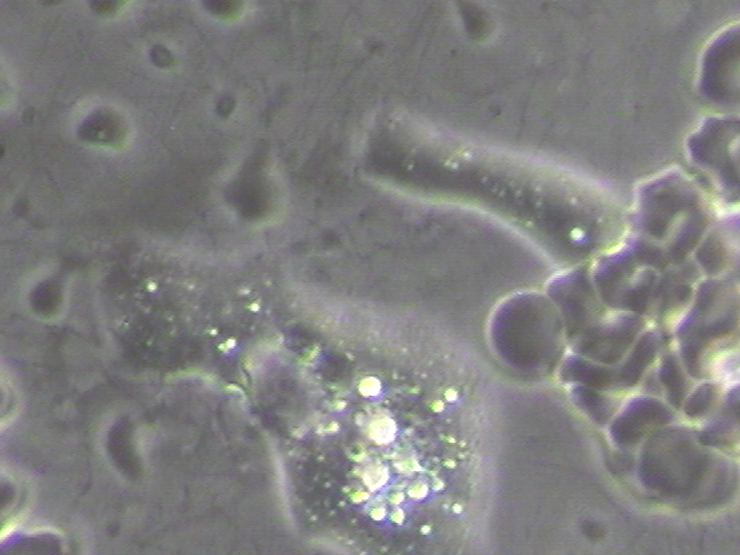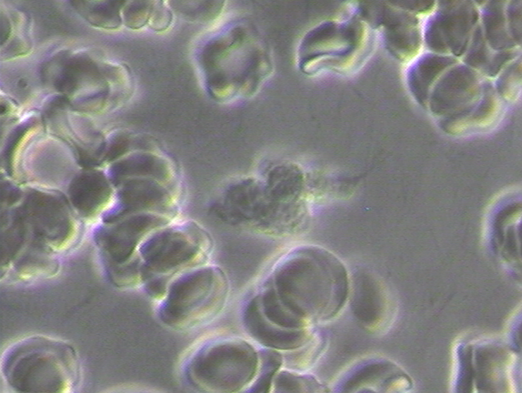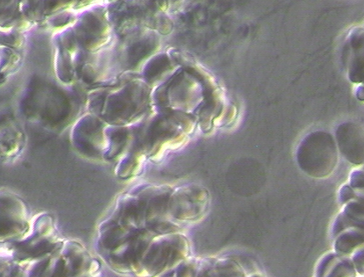 Normal healthy red blood cells should be even in color, even in shape and finally even in size. (Phase Contrast Micrograph 5) Keeping the red bloods cells separated is critical so they can enter the pulmonary capillaries that lead to the alveolus sacs where the red blood cells eliminates acidic waste of carbon dioxide and lactic acid and adsorb and then absorb life-giving oxygen into the hemoglobin molecule. The following phase contrast micrograph is what normal healthy red blood cells should look like![12]