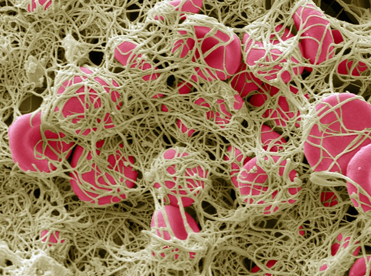 When red blood cells group or clot together into a fibrin net, a clotting protein created when there is injury to the cell membrane and/or endothelial cells that protect the lining of blood vessels, (See Picture 2) the red blood cells cannot enter into the pulmonary vein and then into the capillary pools to release their acidic carbon dioxide waste and pick up oxygen in the alveolus of the lungs. (See Illustration 1)[5]