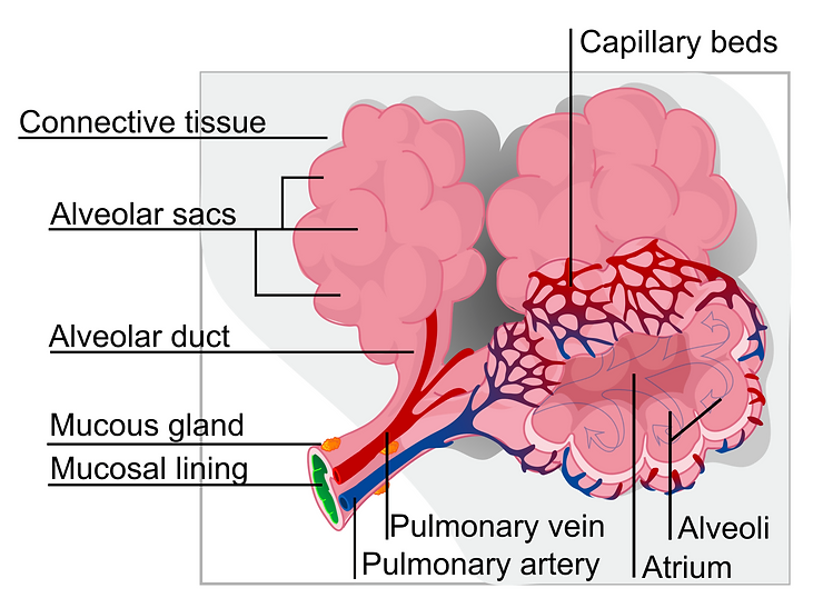 The alveolus of the lung (plural: alveoli, from Latin alveus, “little cavity”), is a tiny structure within the lungs measuring approximately 200 micrometers, or just a fraction of a centimeter. These tiny alveoli are bunched together in grape-like clusters to form alveolar sacs. On the surface of the alveoli are networks of tiny blood vessels called capillaries. It is through these tiny capillaries that airway oxygen from the air you inhale diffuses into the blood stream as a result of partial pressure. At the same time, carbon dioxide, the waste product of respiration, moves from the capillaries into the alveoli and out through the airways of the lungs where it is blown out with the next exhalation. [2]