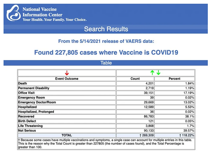 Every Friday, VAERS makes public all vaccine injury reports received as of a specified date, usually about a week prior to the release date. The latest data shows that between the 14th December 2020 and the 14th May 2021, a total of 227,805 total adverse events were reported to VAERS, including 4,201 deaths — an increase of 144 over the previous week — and 18,528 serious injuries, up 1,338 on the previous week.