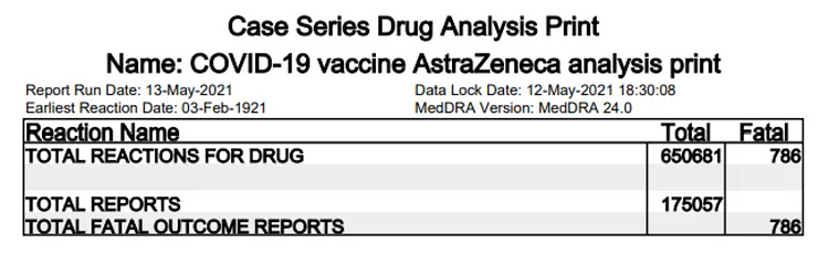 According to the Government’s 16th update on adverse reactions to the AstraZeneca vaccine using data inputted to the MHRA Yellow Card Scheme up to the 12th May, the number of deaths due to the AstraZeneca jab has increased by 773.33% since the 1st report to a grand total of 786.