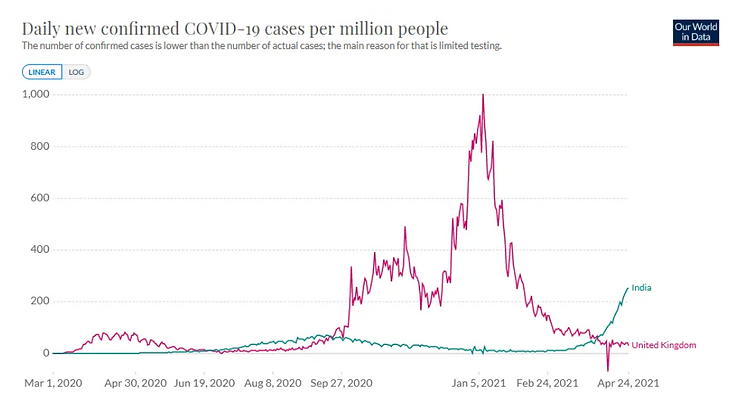 But just showing you the data for India isn’t enough to justify our point that the mainstream media are manipulating you and lying to you. To do this we need to put the data into context and compare it with another country, such as the United Kingdom.