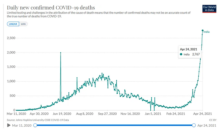 Well the latest data shows us that on the 24th April 2021 2,767 deaths were attributed to CoV – 12 now called 19, the highest to occur in India so far. But let’s put that into context, with a population of 1.4 billion that is just 0.0001% of the population. And to put it into further context India sees on average 25,270 deaths per day from all causes.