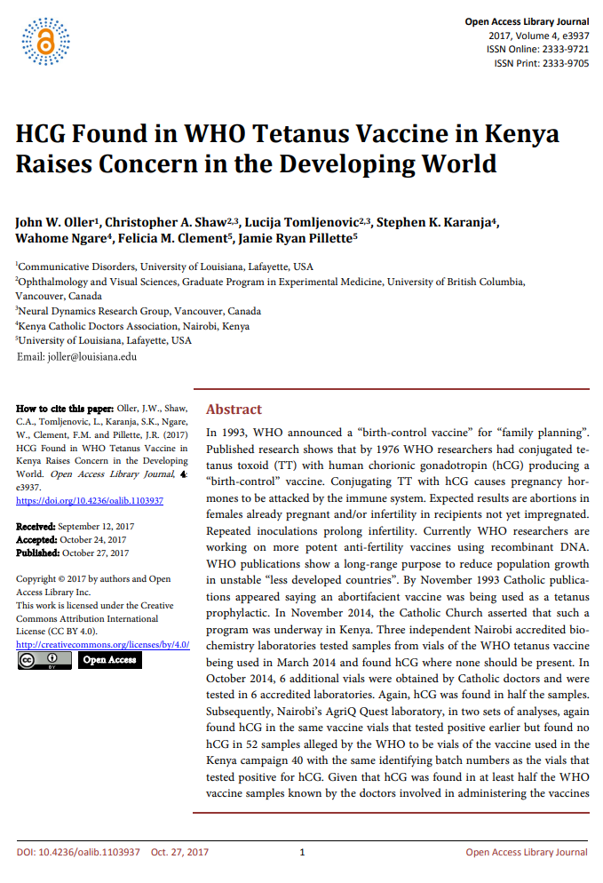 HCG Found in WHO Tetanus Vaccine in Kenya Raises Concern in the Developing World/Oller, Shaw, Tomljenovic, Karanja, Open Access Library Journal, 2017, ResearchGate