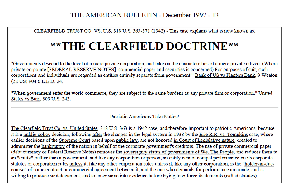 The Clearfield Doctrine is a series of conclusions derived from a 1942 Supreme Court ruling on a US case Clearfield Trust Co. Vs. U.S. and a couple other cases, which essentially establish: