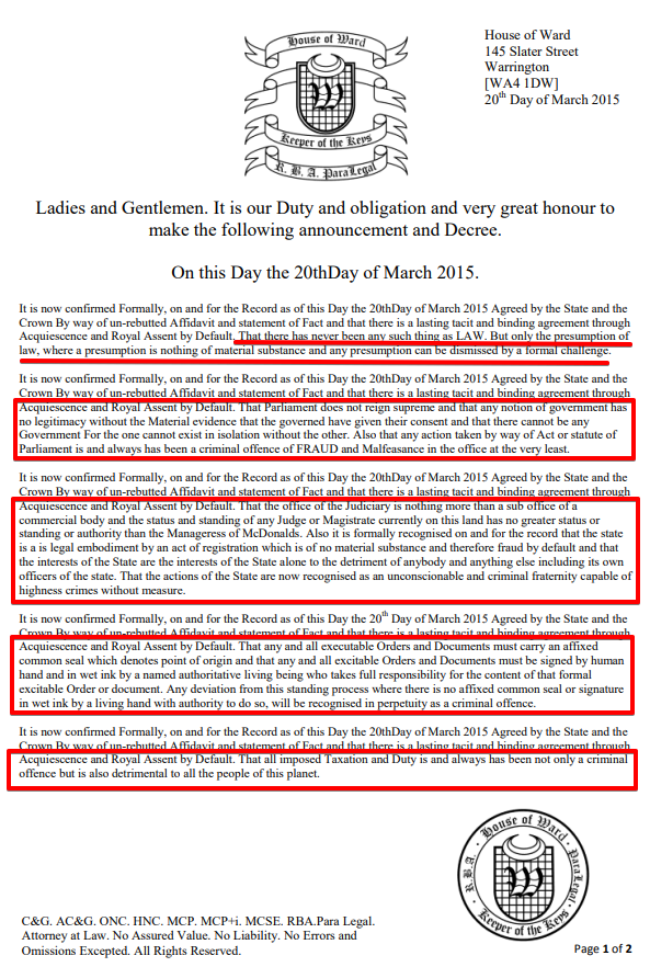 Affidavit of Truth and Statement of Fact by Baron David of the House of Ward, 2015, a fascinating read which enumerates the presumptions of law and public office and refutes them, PDF Here