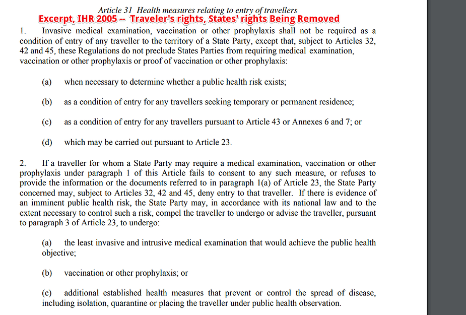 Excerpt, Screenshot from the IHR 2005, Third Edition, just a tiny glimpse into the profound abrogation of all God-given rights and freedoms intended for all living people seeking to travel across nation-state borders by this document.