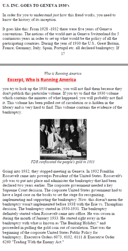 (National sovereignty actually does not really exist in the global debt-based economy however, please see the sections on Sovereignty below, especially see the 1930 Geneva Agreement and the Clearfield Doctrine: As private corporations using debt-notes (FRNs/US Dollar), governments have lost their sovereignty status. We have been subject to a layered worldwide deception, since 1913 in particular.)