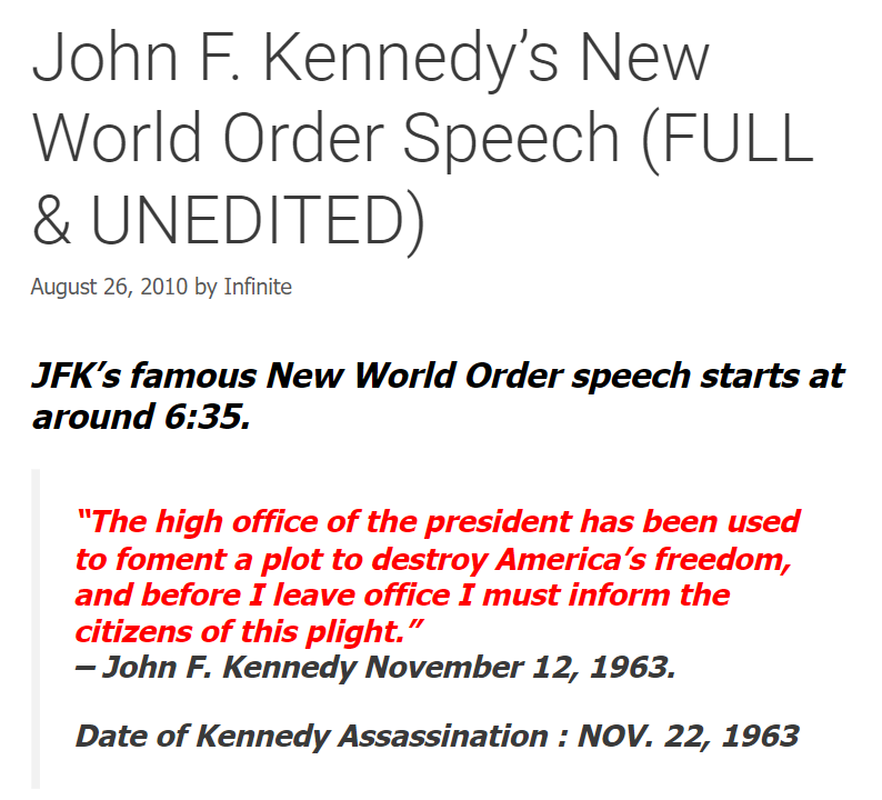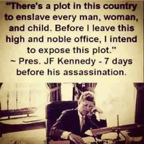 US Incorporated, President John F. Kennedy is widely quoted online as having exposed a century-long plan to most fully enslave every American and indeed every human on the planet, both financial and physical slavery at Columbia University, a week before his assassination; his 1961 speech to the American Publishers’ Association does address an awareness of secret societies and speaks against secrecy.