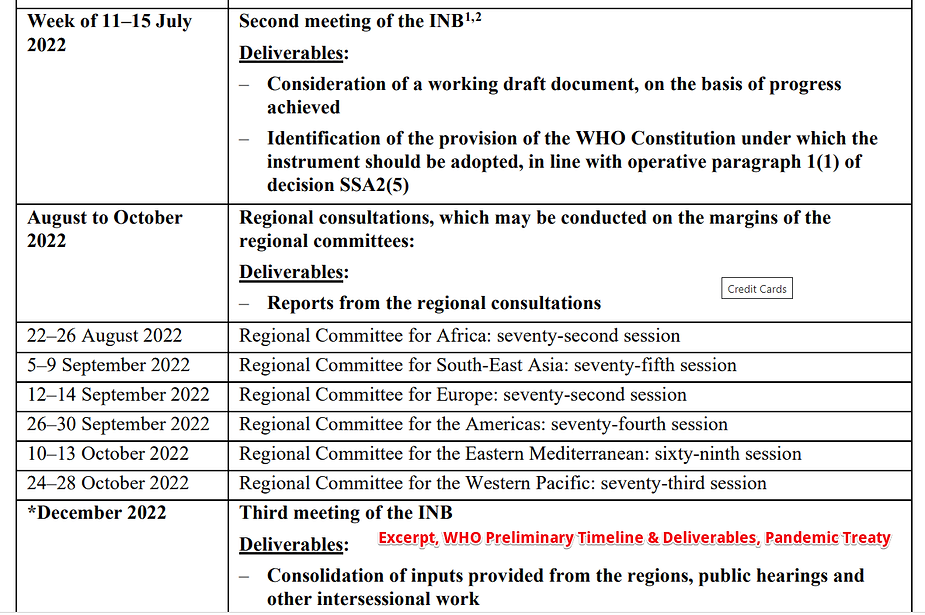The WHO has published a (specious) agenda marking time periods for rumination, assembly, drafting, finalizing, and sealing the deal. This arcs across 2022 to 2024, when, it is anticipated, the set-up “World Pandemic Treaty” will be rolled out like a spiky bandanna, throttling everyone alive.