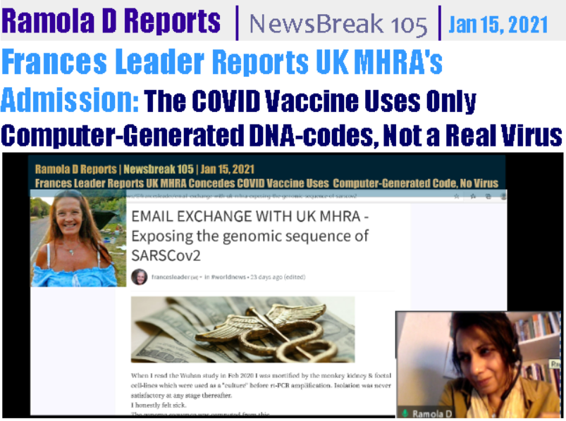 What is in the COVID Vaccine (apart from the massive IN Toxification of Graphene et al, now proved by optical and electron microscopy as well as energy spectroscopy) is not a “virus” after all but synthetic material concocted from a computer-generated genomic sequence (of the kind Dr. Cowan describes in Report 284) for a supposed spike protein on the supposed SARS-COV-2 virus, as science researcher Frances Leader established early on, from her correspondence with MHRA UK, covered here:
