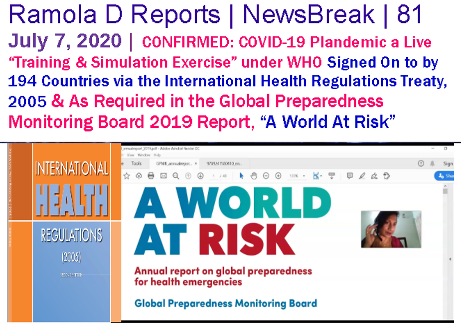 Not really a report but a demand-document, the GPMB demands that the UN, the WHO, and all 196 countries signing the IHA 2005 run live training and simulation exercises to run “Plandemic-Theory Mayhem” on the world, which then Secretary of State Mike Pompeo confirmed as a “live drill” in a now-famous press conference on the never-proved-to-exist “Corona Virus.”