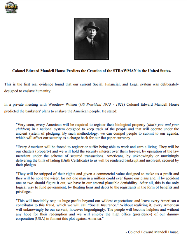 Proto-globalist from another time, the Colonel wasn’t a Colonel but a politician and diplomat who advised US Inc. President Woodrow Wilson and influenced many others, helping Wilson draft the Treaty of Versailles, Covenant of the League of Nations, and set up the Council of Foreign Relations, although it seems he fell out with Wilson later; perhaps his Intimate Papers will reveal more of his true affiliations. The quote below regarding biological takeover of Americans by the Bankers is widely attributed to him.